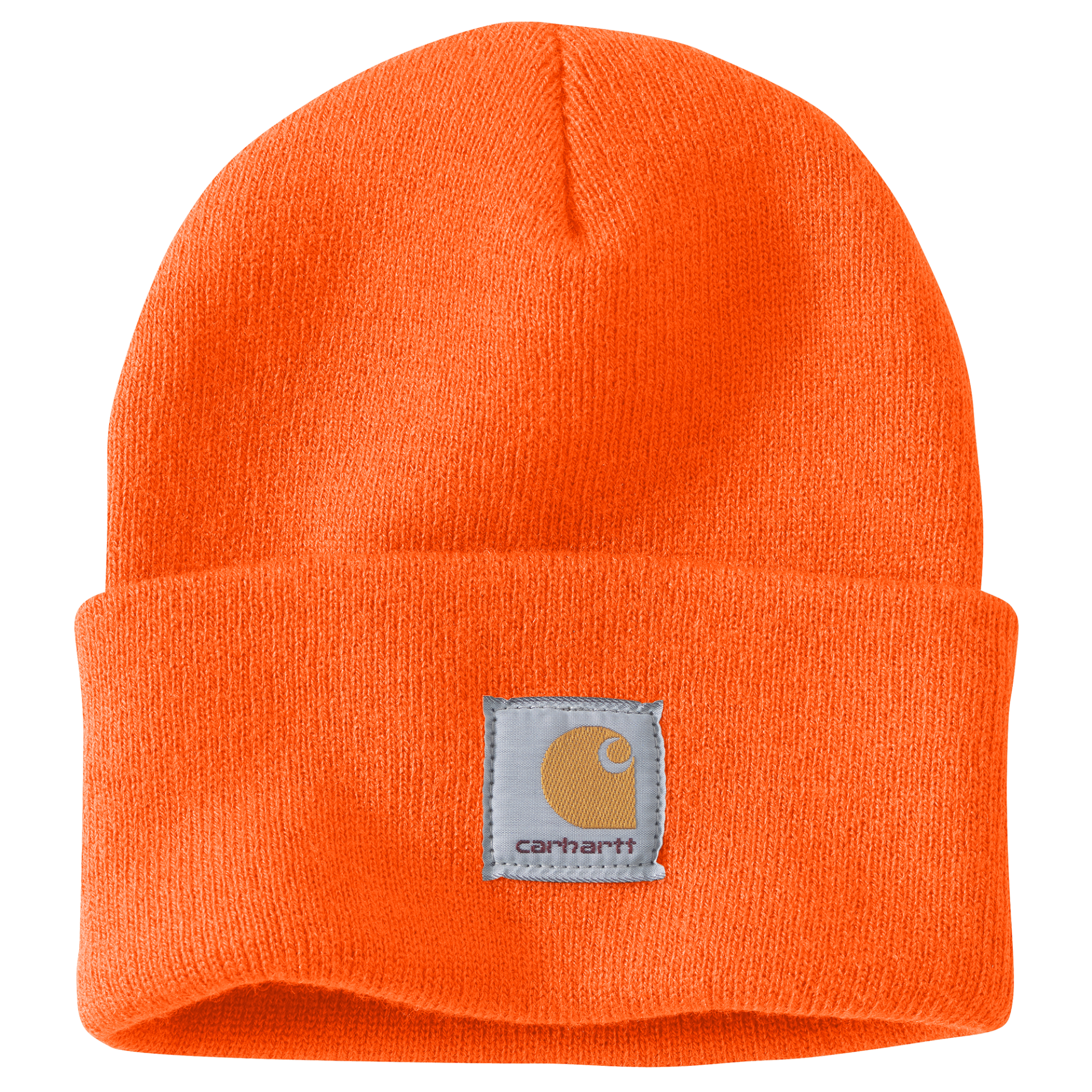 Carhartt men’s cuffed beanie in Brite Orange with 100% acrylic stretchable rib-knit fabric and front Carhartt patch for cold-weather wear.